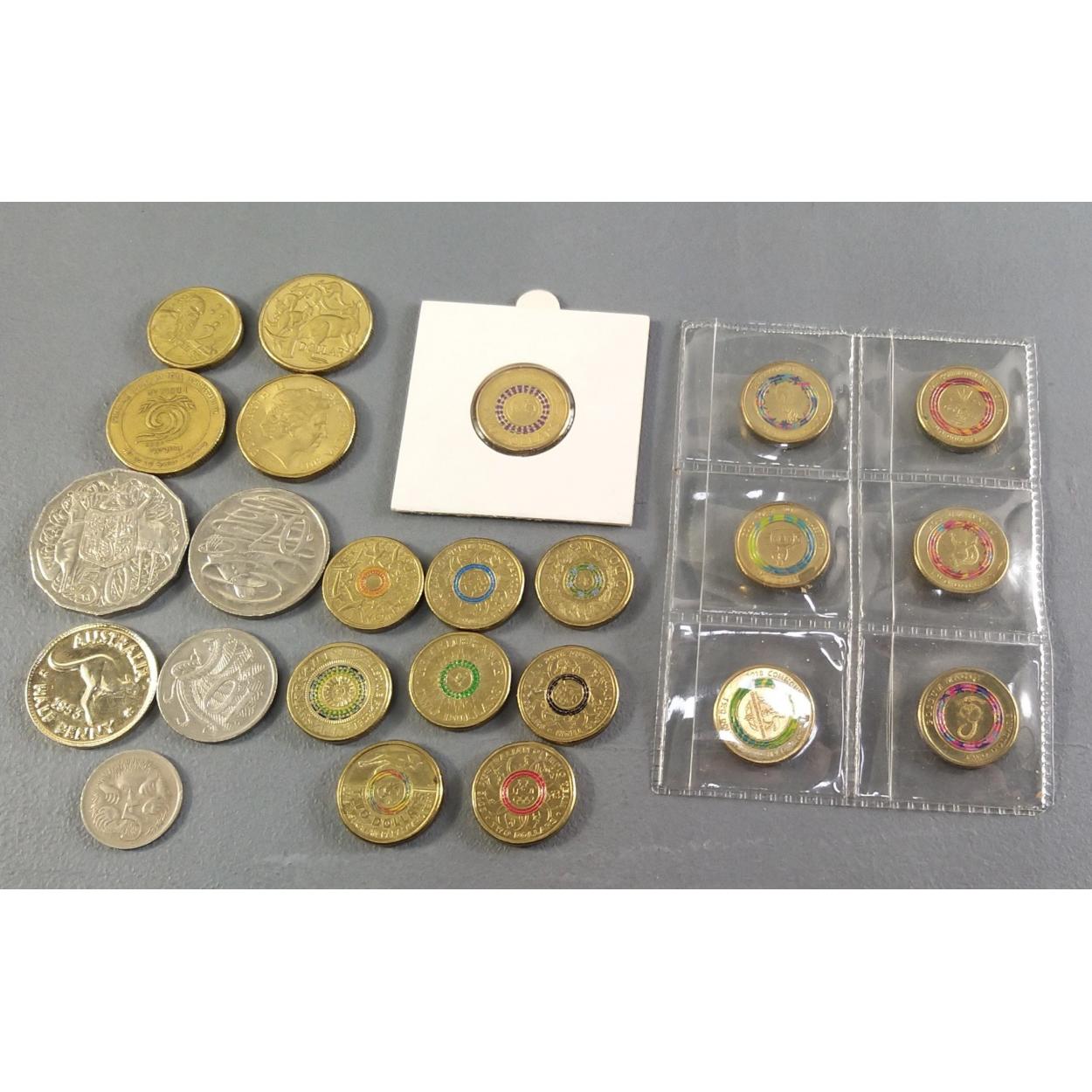 A selection of AUSTRALIA coloured coins some in sleeves, 15 in total plus some other Australian coinage.