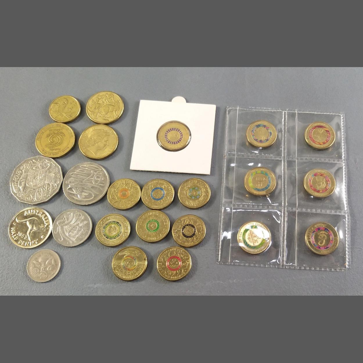 A selection of AUSTRALIA coloured coins some in sleeves, 15 in total plus some other Australian coinage.