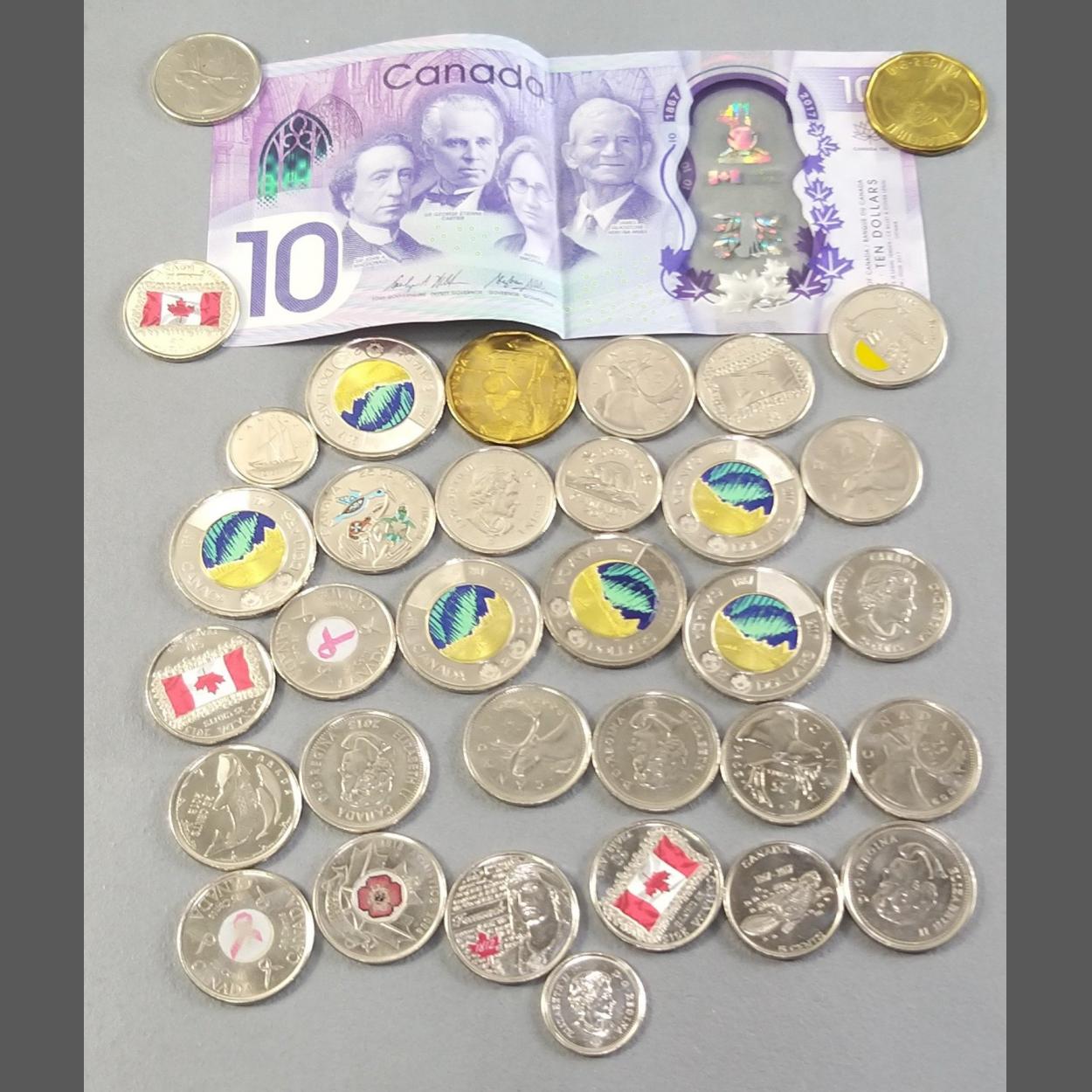 A selection of CANADA coloured coins some in sleeves, 15 in total plus some other Australian coinage INCLUDING A CANADIAN TEN DOLLAR BANKNOTE .