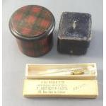 Intriguing little lot comprising MAUCHLIN WARE box in Duff tartan, a MOFFAT jeweller's antique ring box and a BRUGES jewellery box with two tie pins