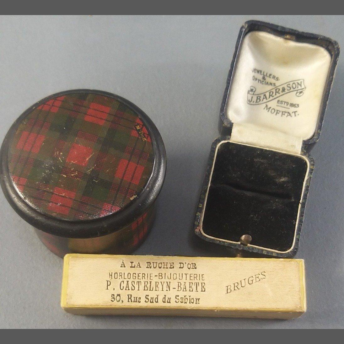 Intriguing little lot comprising MAUCHLIN WARE box in Duff tartan, a MOFFAT jeweller's antique ring box and a BRUGES jewellery box with two tie pins