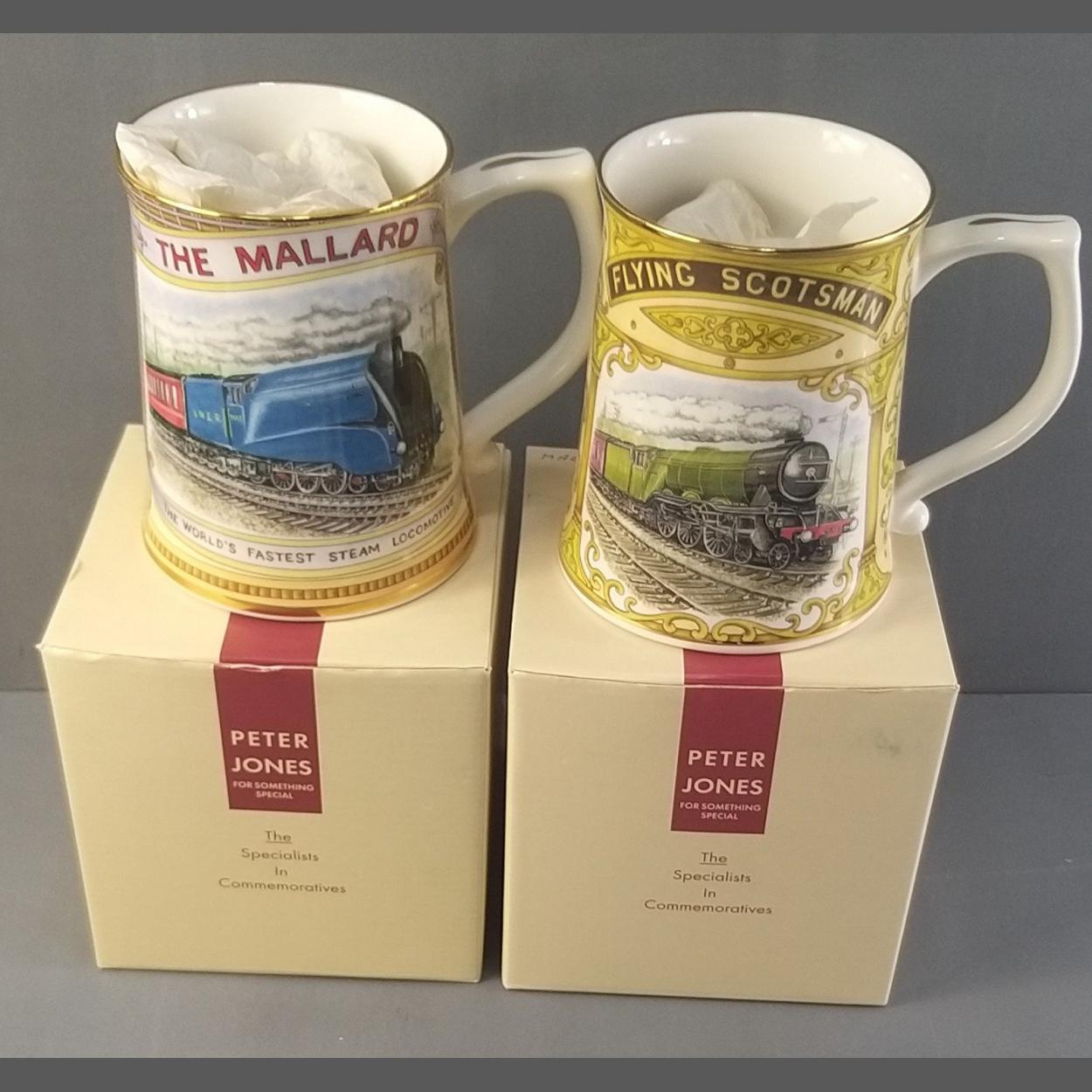 Two PETER JONES large railway themed collectible tankards in boxes. THE MALLARD and FLYING SCOTSMAN each 14cm tall approx.