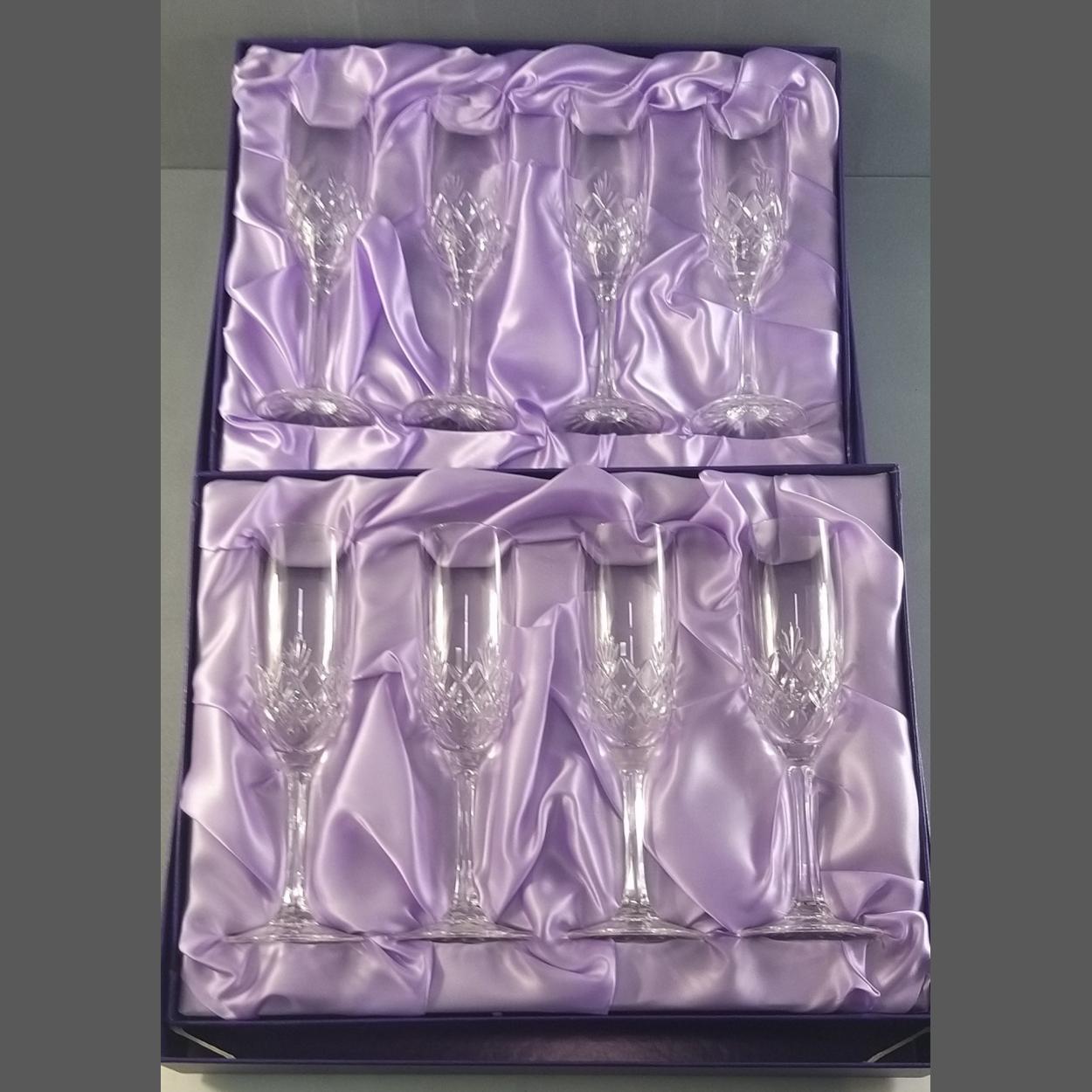 Two boxed sets of EDINBURGH CRYSTAL champagne flutes. Eight glasses in wonderful condition each stamped to foot.