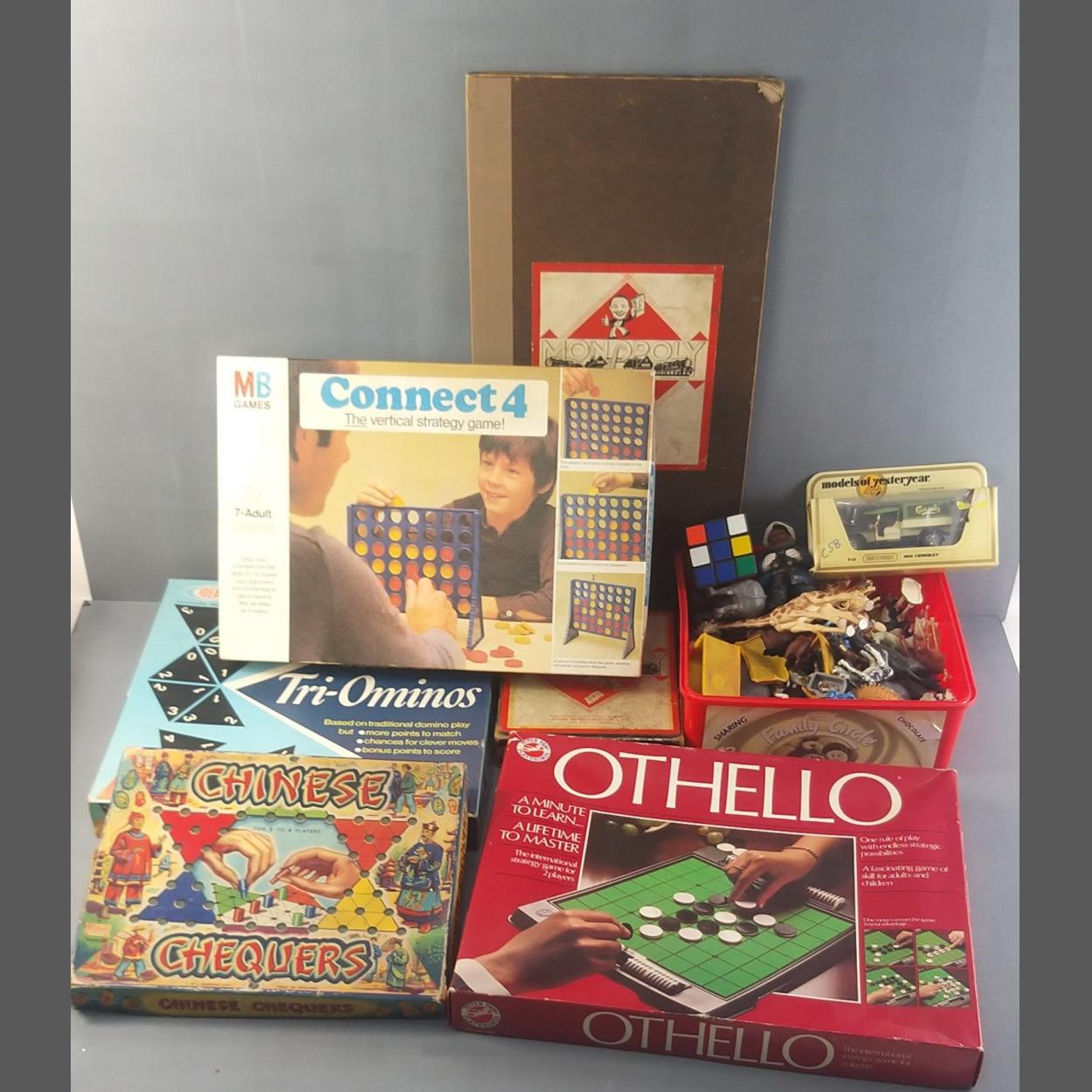 A collection of old board games, room diffuser, Rubik's cube, plastic animals etc