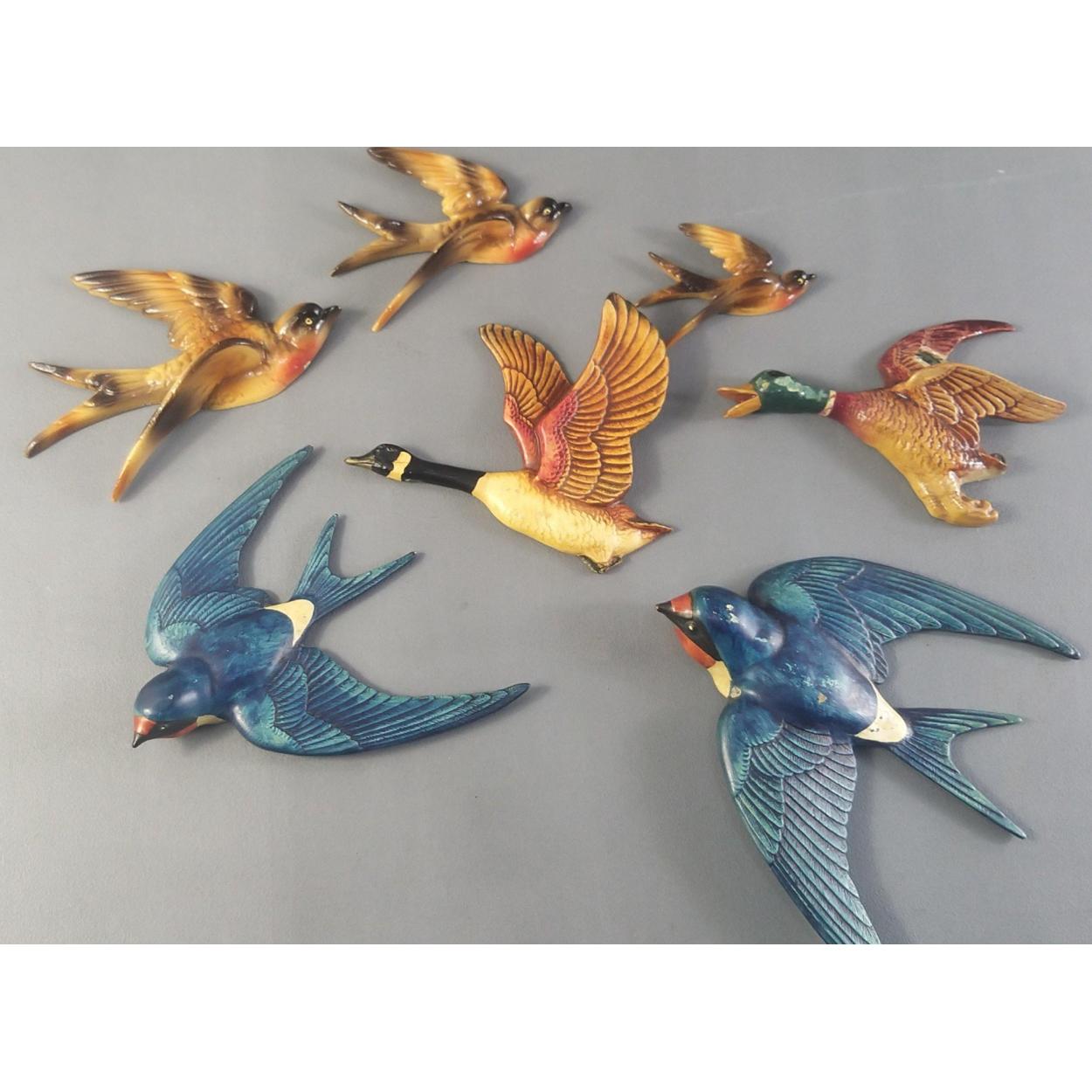 A small collection of decorative birds to include 2 swallows (16cm approx) plus flying geese etc. With some damage.