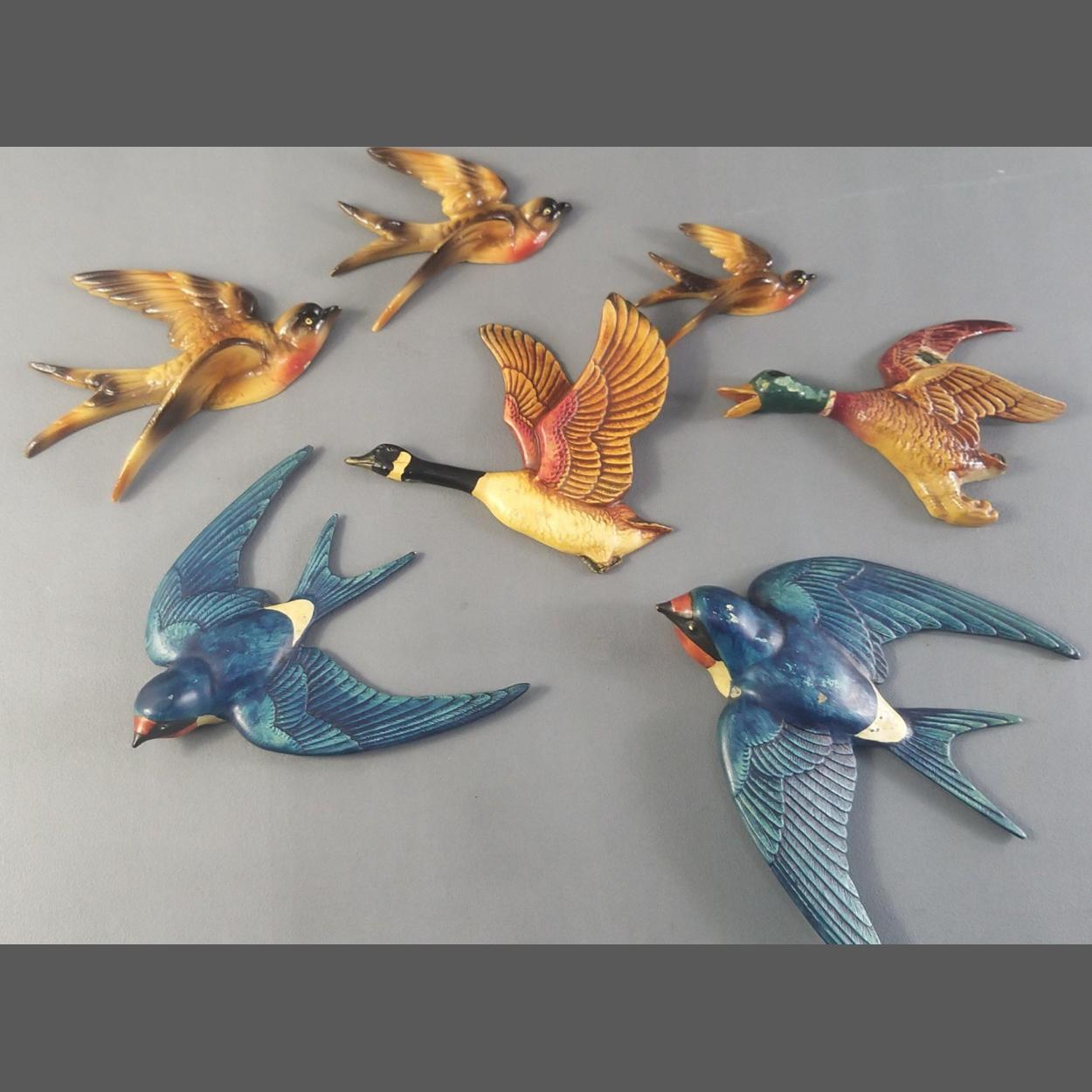A small collection of decorative birds to include 2 swallows (16cm approx) plus flying geese etc. With some damage.