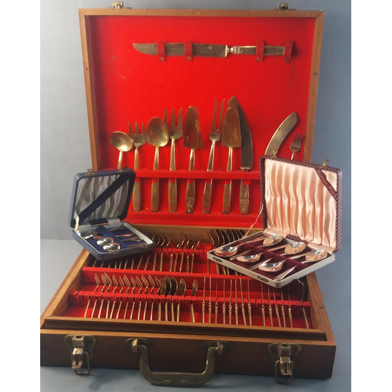 A two tier canteen of cutlery comprising a service for 12 with some pieces missing. Also includes a boxed set of 6 EPNS spoons and one box of 4 EPNS coffee spoons