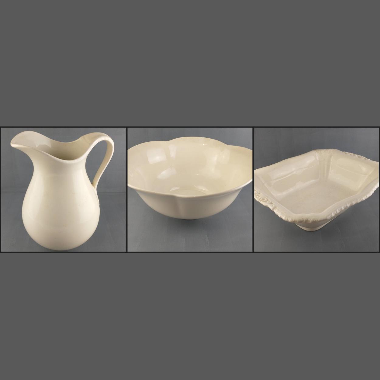 Large Creamware ewer and basin with a large Wedgwood dish (A/F repair).