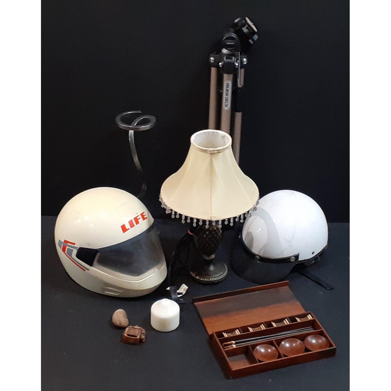 A mixed lot to include 2 safety helmets, pineapple like table lamp, tall candle holder, tripod, partial chopstick set