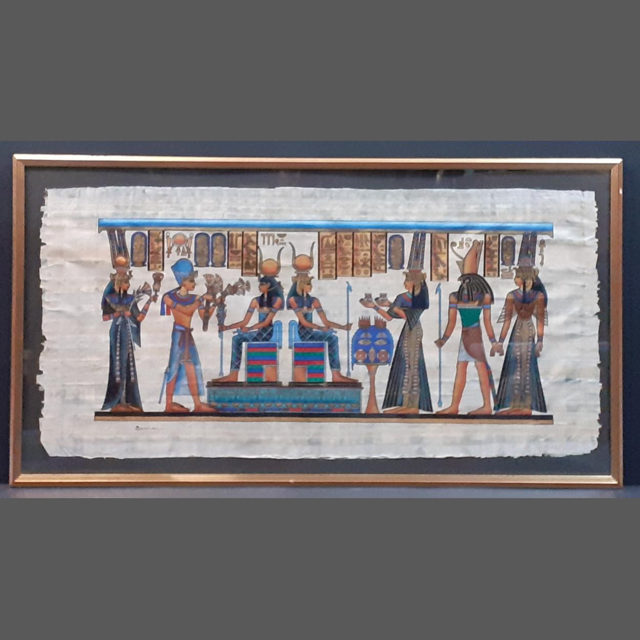 A large and attractive Egyptian framed papyrus art work piece. Colourful and impressive piece. 53cm x 100cm approx. Nicely framed in subtle gilt frame.