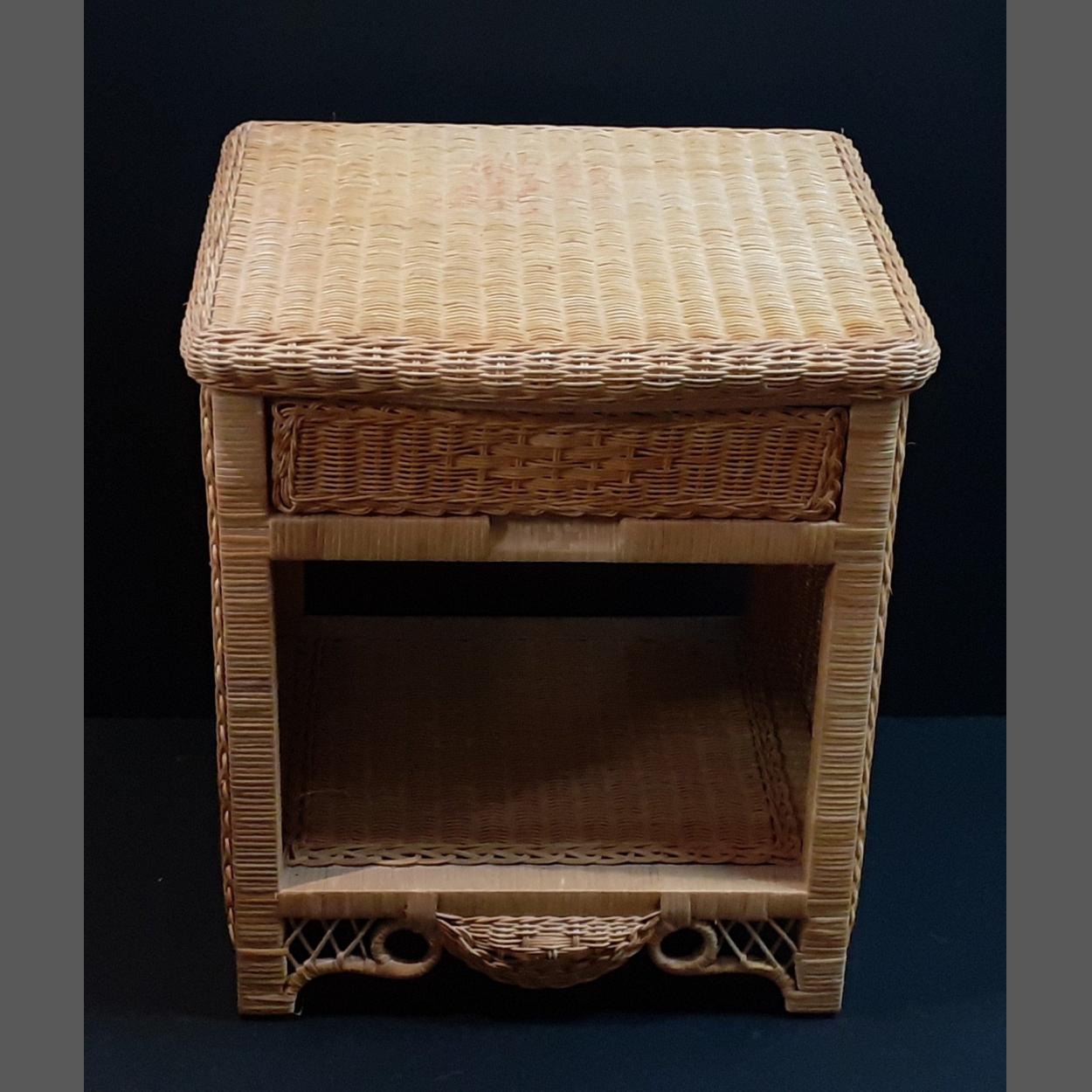 A wicker table with drawer measuring H65 x W55 x D46cm approx