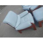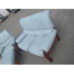 REMARKABLE RETRO Light blue leather G-Plan (label on footstool) two seater suite with an arm chair & footstool - it's just SO COOL! - in good condition for all the decades of daily wear and tear - quite remarkable indeed! - the vendor really looked after this much loved suite.