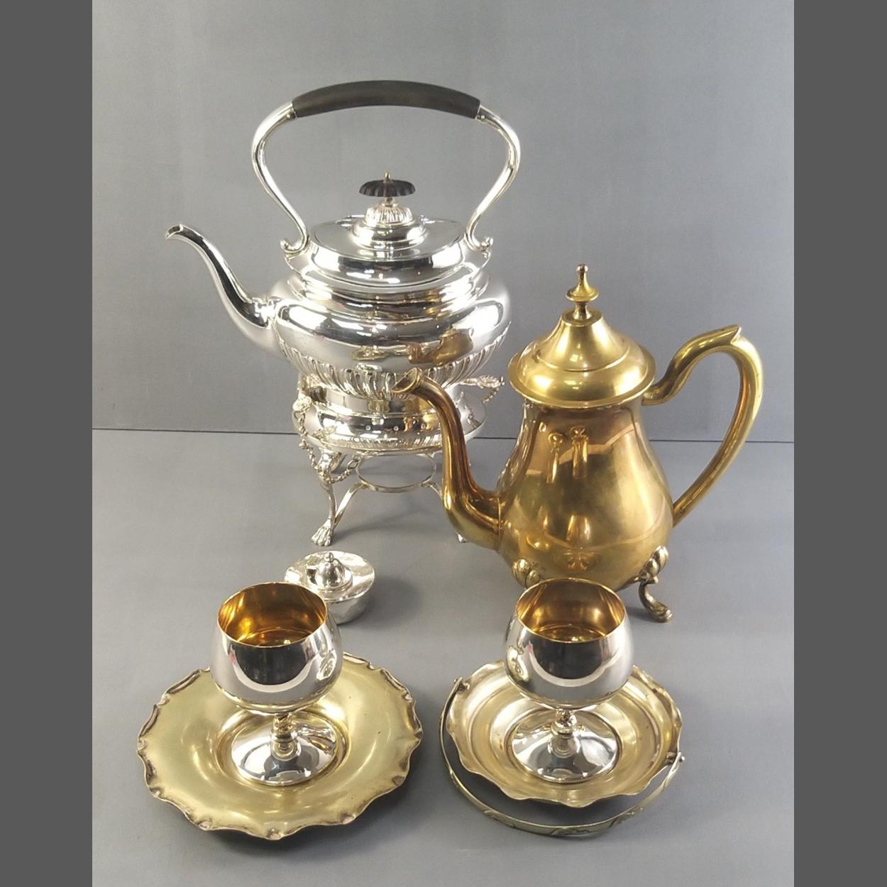 A silver plated teapot with burner, handle detached but still a beautiful piece, plus a gilt teapot with detached lid, 2 trays and 2 goblets.