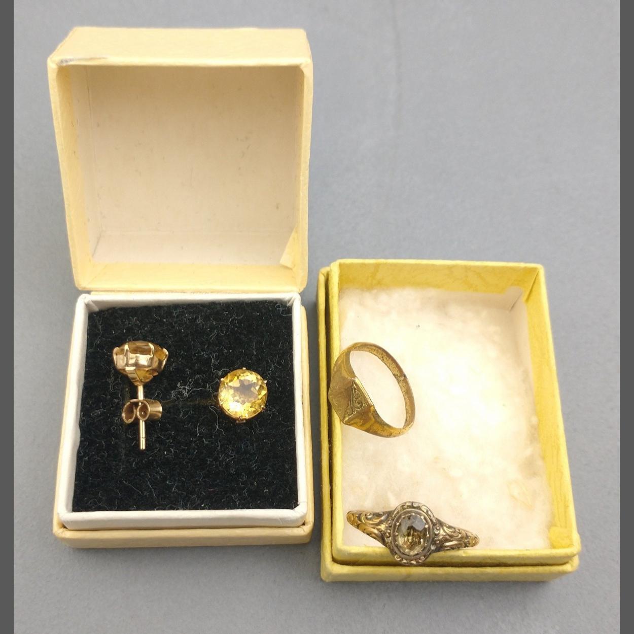 A pair of 375 stamped earrings set with topaz coloured stones plus 2 unmarked rings (one cut open)