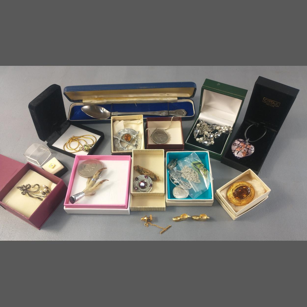 A collection of costume jewellery to include necklaces, brooches, Churchill crown, tiepins, a mounted Isle of Man 1975 coin, plus a 925 chain (38cm long approx), and 2 silver pendants. Some interesting items.