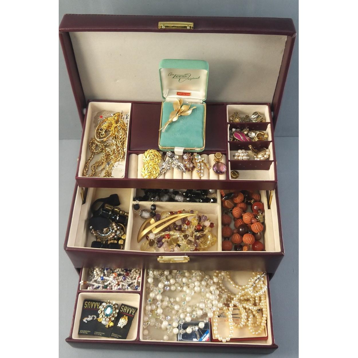 A super plush cantilever jewellery box with contents. Includes some Swarovski crystal pins, beads, earrings, pendants and much, much more.