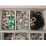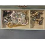 Small jewellery box with lots of beads, pearls, earrings, pins etc. An interesting lot.