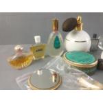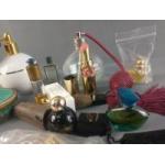 Two perfume atomisers plus a collection of trial size bottles of perfume and also a vintage 4711 face powder box