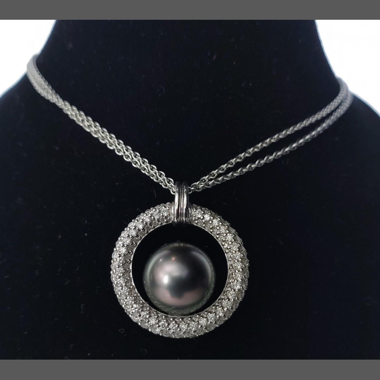 A 750 stamped chain and 750 pendant with a large grey centred cultured pearl with circular support studded with diamonds - gross weight 15.5g approx - chain length 16" approx