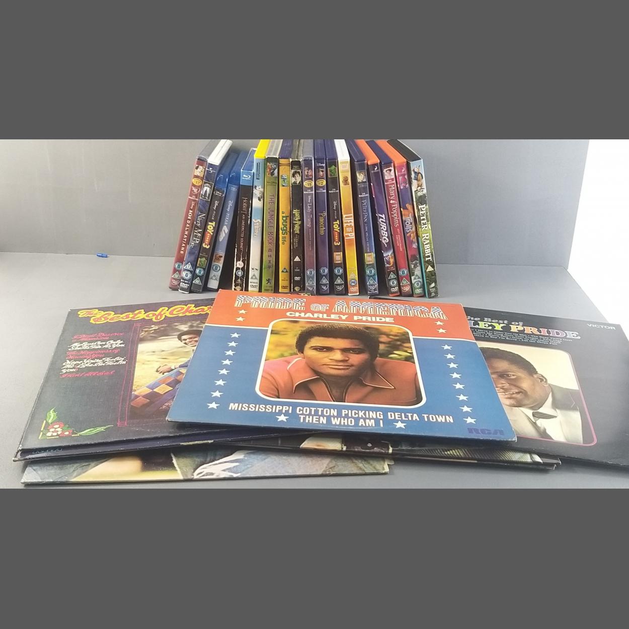 A small box of children's DVDs to include diamond edition LADY and the LAMP, RACING STRIPE etc. Plus 8 CHARLEY PRIDE LPs