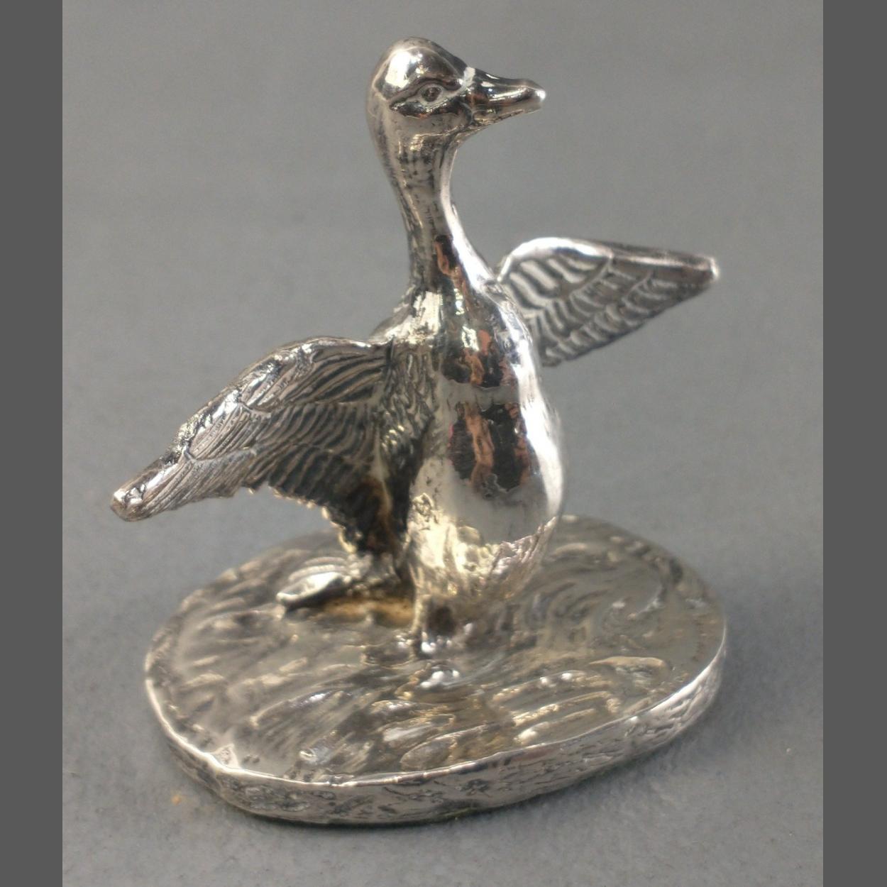 A lovely little sterling silver model of a duck with spread wings. Stands 55mm approx. Felt base, gross weight 24.5g approx. 925 stamp, indistinct hallmarks.