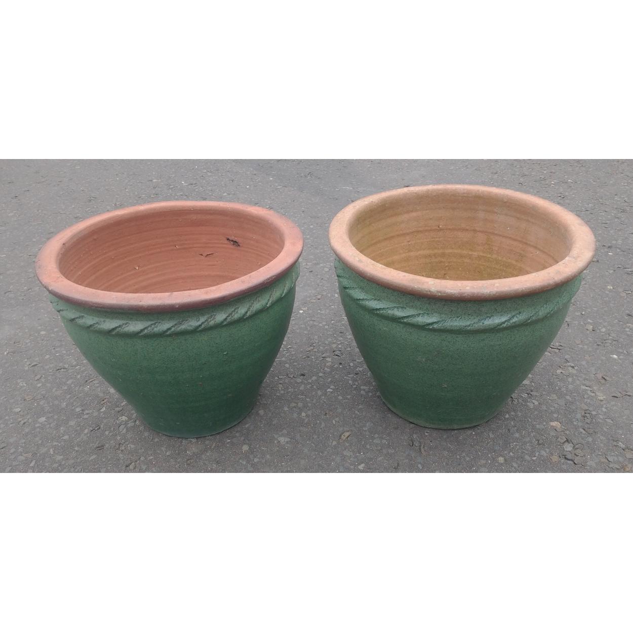 Two green rope design flower pots in good order. Height 12" and 15" diameter approx
