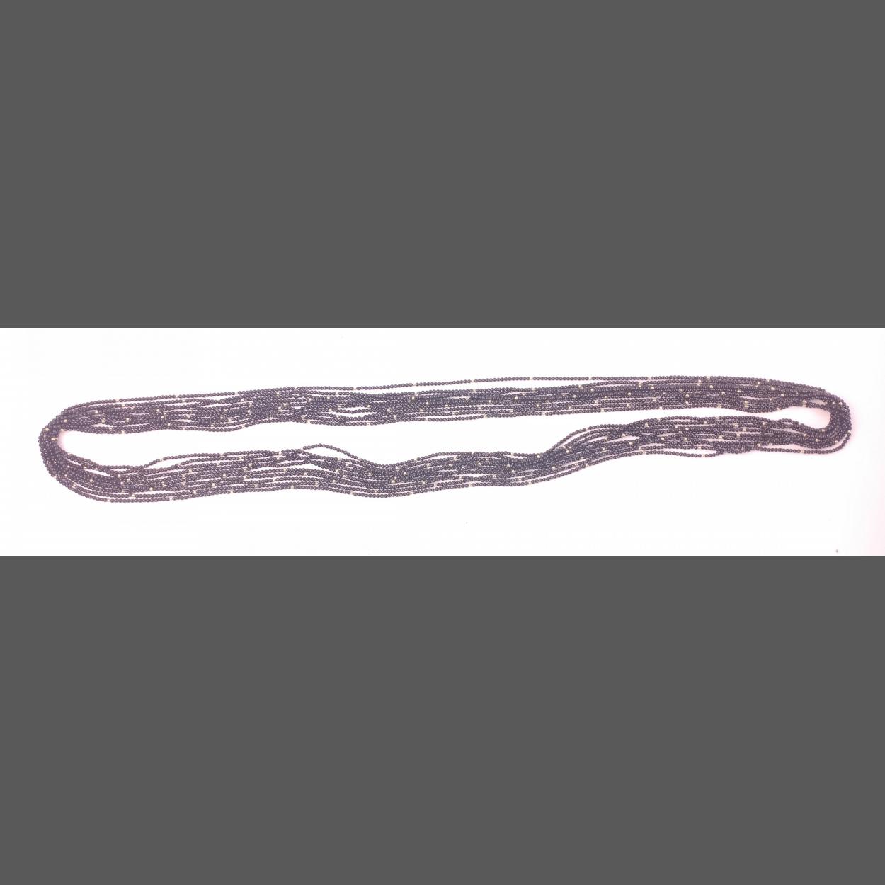 Ten strands of tiny threaded black beads with tiny seed gold coloured balls all within a Hamilton & Inches jewellers box. Approx 94cm long