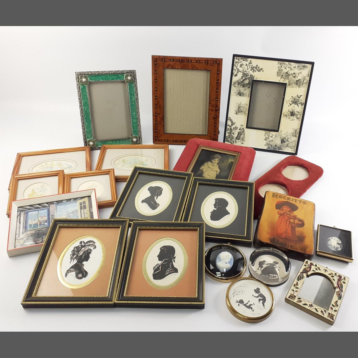 A good selection of small decorative picture frames some with contents. Nice decorative lot including some modern silhouettes.