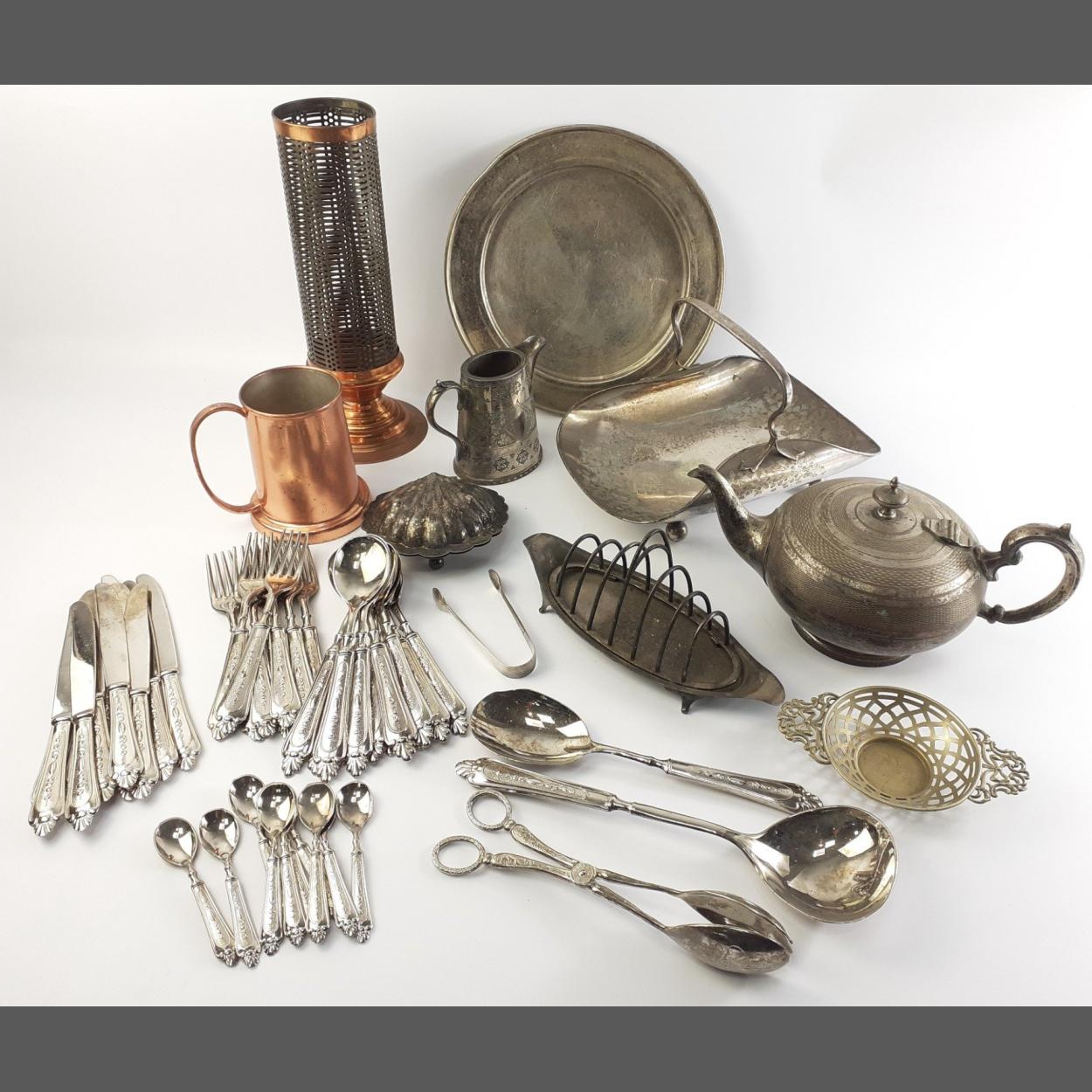 A selection of metalware pieces to include a Walker and Hall 27cm plated tray, an Aladdin style lamp, toast rack and much else.