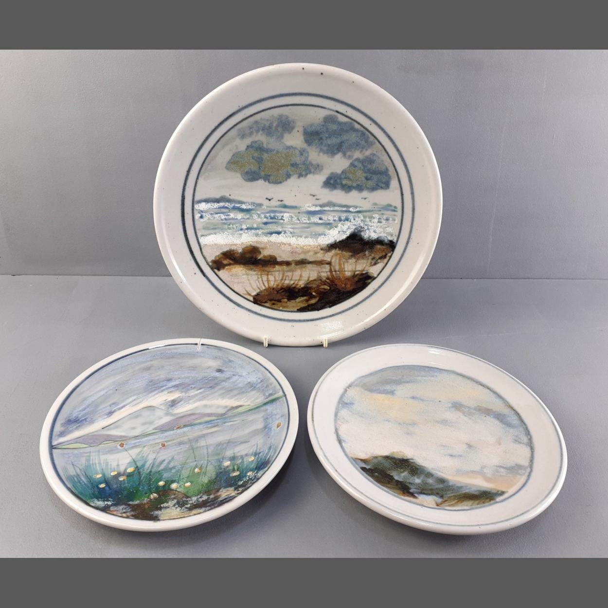 HIGHLAND STONEWARE. Three plates. Lovely earthy pattern plates, 26cm plate and one other. Also a factory second plate with edge split.
