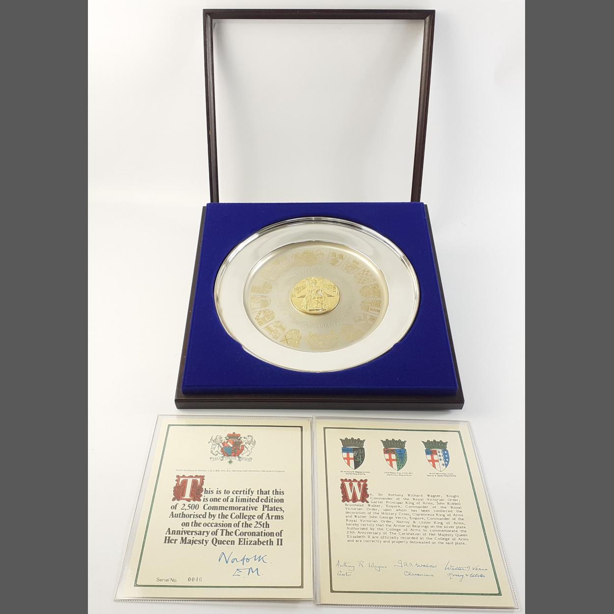 A sterling silver fully hallmarked commemorative plate. Issued in 1978 THE COLLEGE OF ARMS and presented in a Perspex frame with paperwork. Danbury Mint circular plate with central 24ct gold plated plaque depicting the Royal Arms, bordered by engravings of The College of Arms and the Kings Arms. Gross weight 580g approx