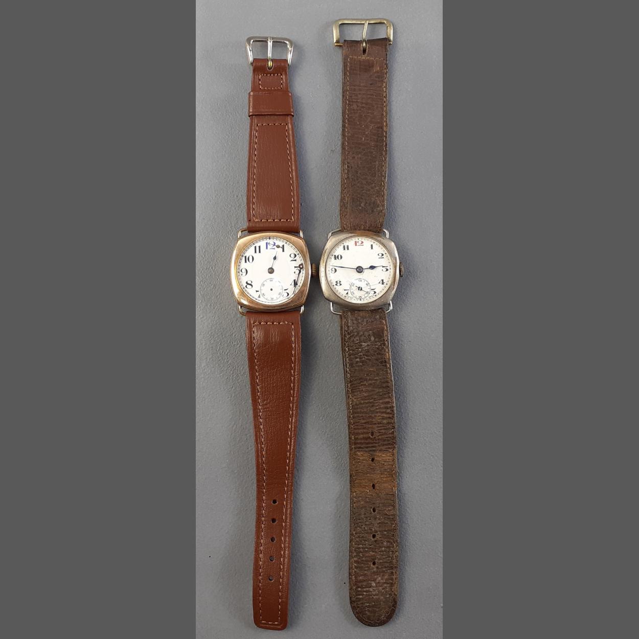Two vintage cushion watches, one CYMA with cushion shape gilt case and one other similar with stainless steel case. Both A/F non running.