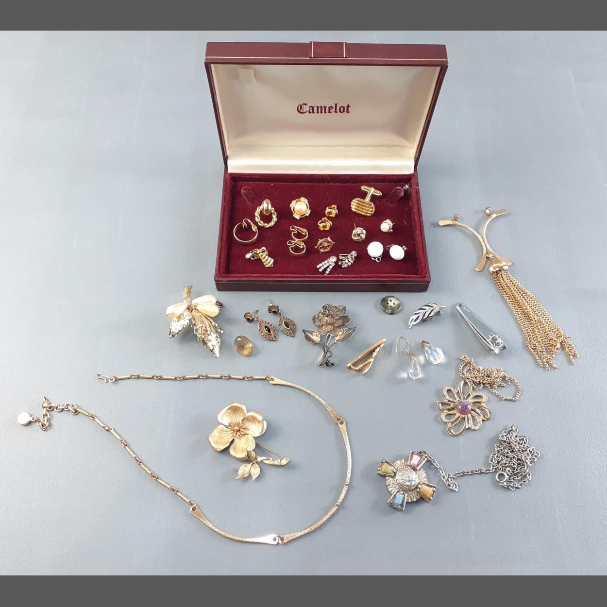 A good selection of unmarked vintage and gilt jewellery in a box. Some pretty pieces.