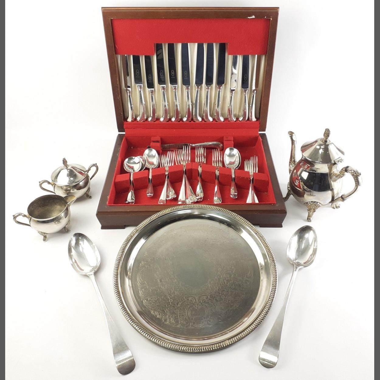 A boxed silver plated canteen of cutlery, silver plated tray, silver plated tea pot and others. A good selection.