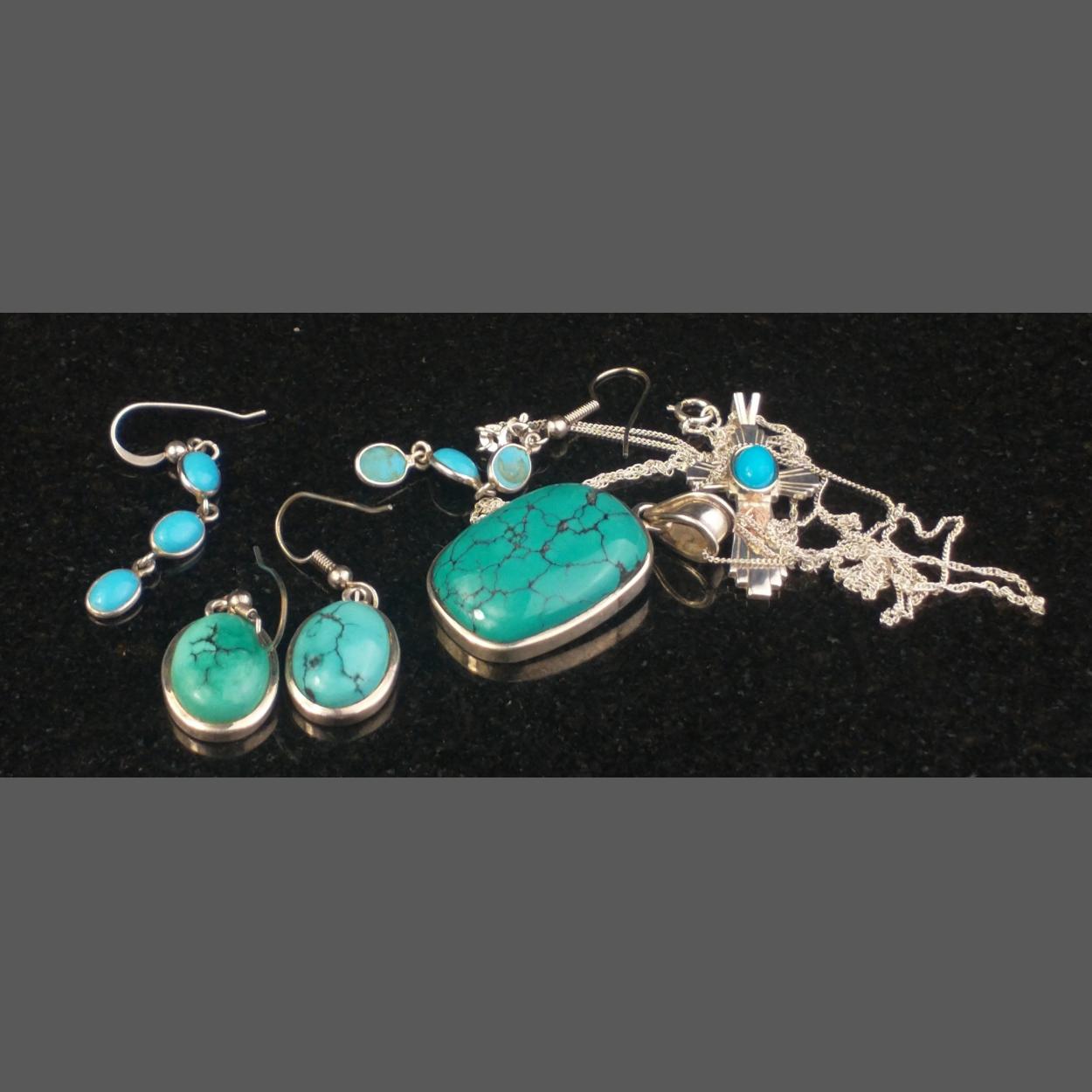 A suite of 925 stamped turquoise stone jewellery comprising pendant with crucifix, pendant with large stone and two sets of earrings.