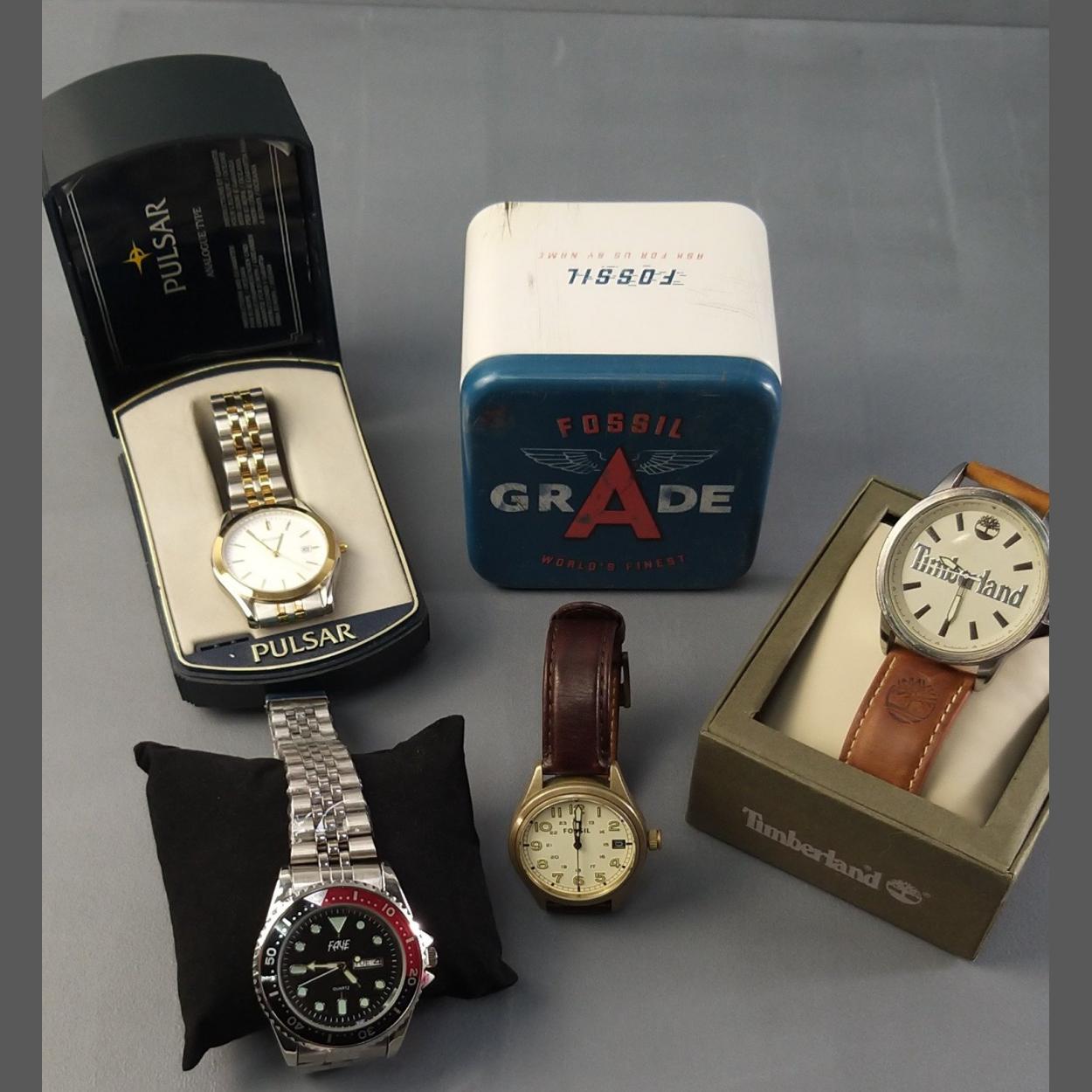 Four nice dress watches to include PULSAR, TIMBERLAND, FAVE and FOSSIL. Batteries may be required.