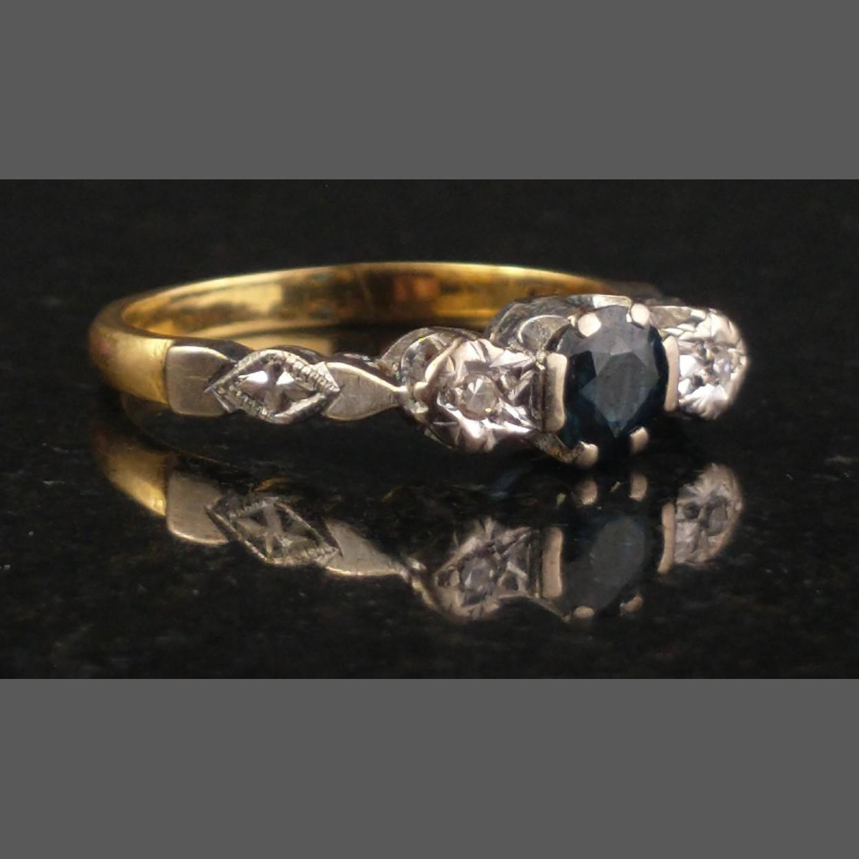 An 18ct stamped ring with sapphire and diamonds (tested) Size L, gross weight 3.1g approx