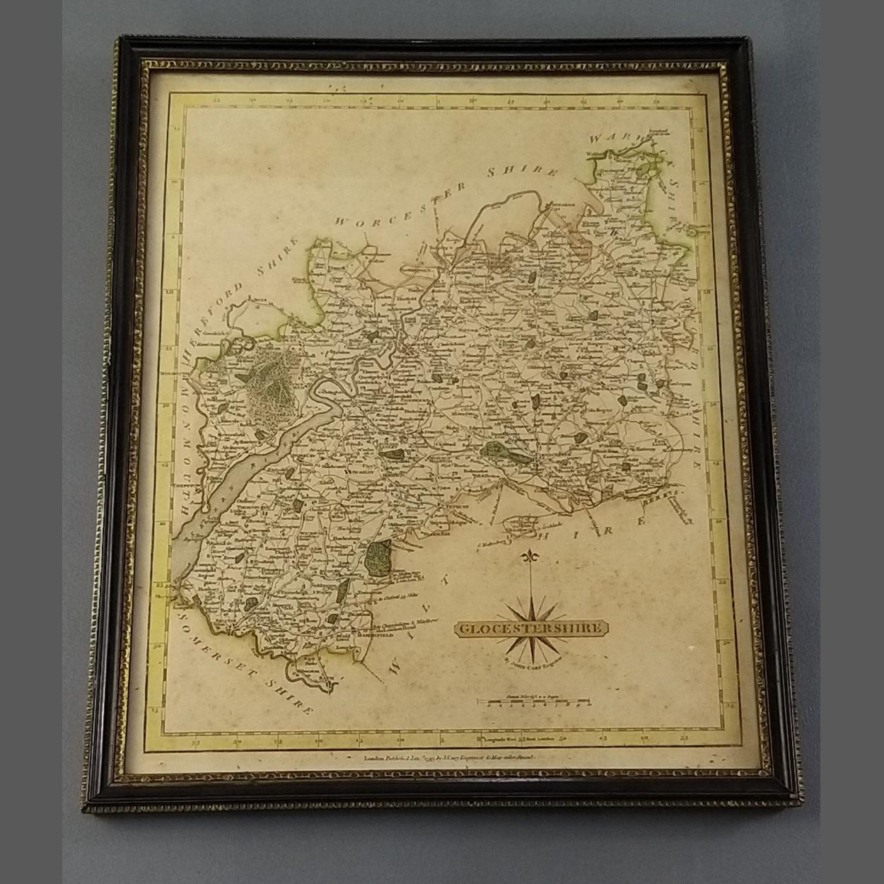 A 1793 JOHN CARY framed county map GLOUCESTERSHIRE. Old spelling of GLOCESTERSHIRE noted on map. Measures 30cm x 25cm approx. Minor foxing noted however attractively coloured and simple older framing.