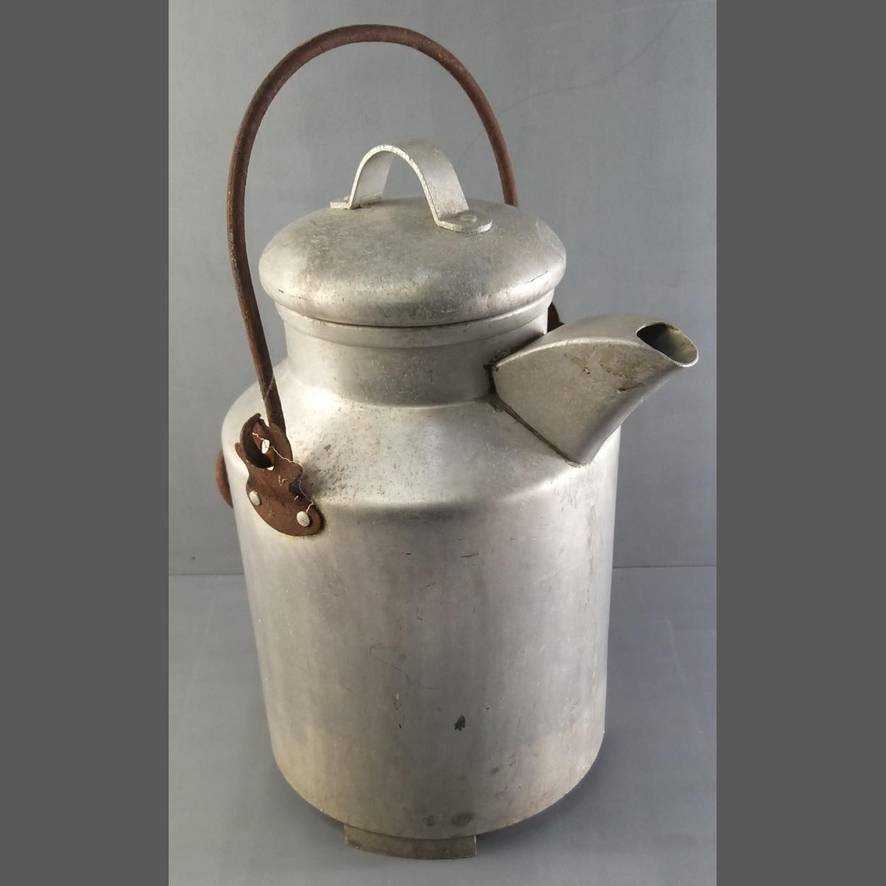 An aluminium vintage lidded milk pail / milk pourer. Stands 42cm tall approx. Would look good in the garden with a floral display.