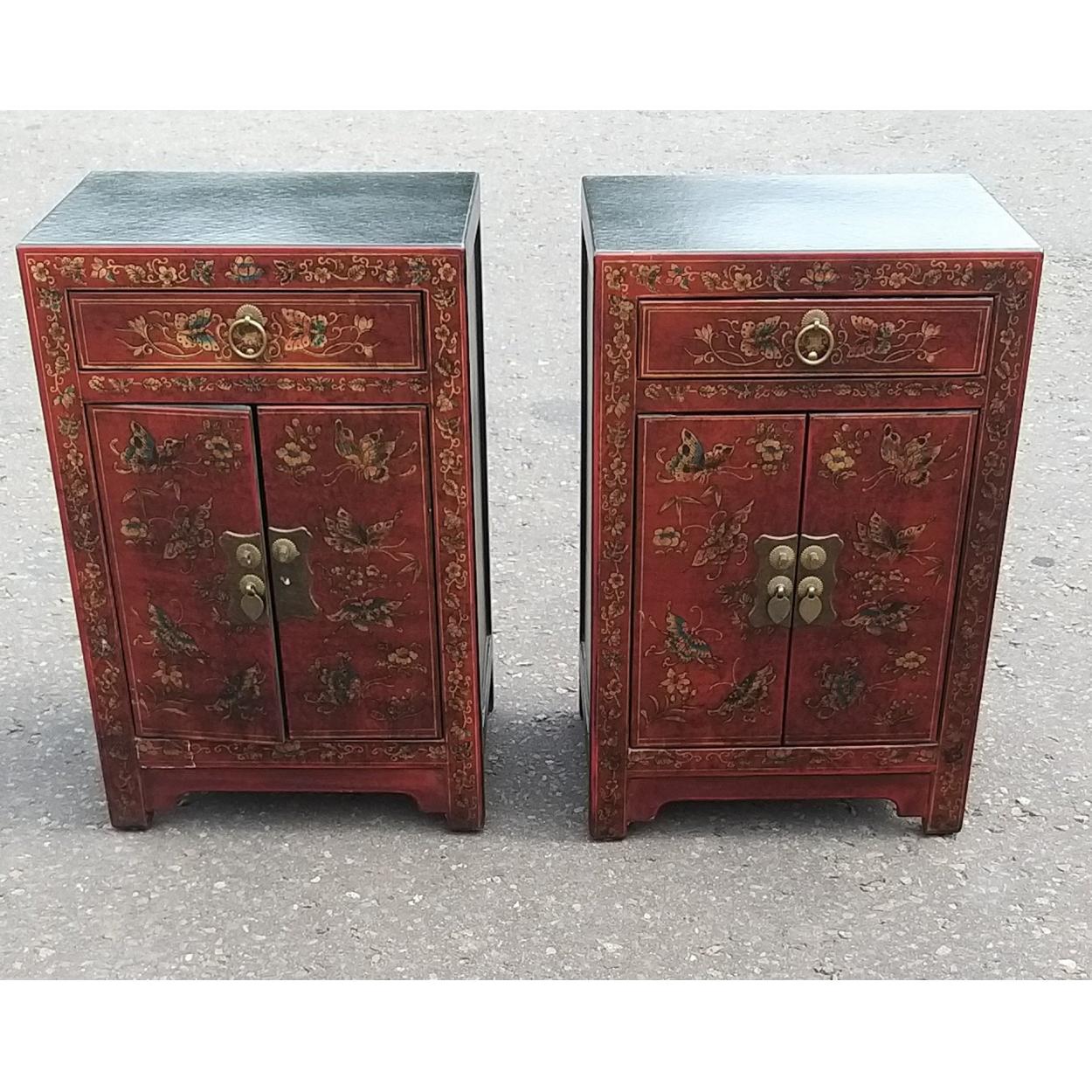 A pair of antique style Oriental red and black lacquered bedside cabinets with a drawer and small cupboard in each - slight damage to one of the cabinets at the bottom left hand corner and one of the handles are missing - none of the cabinets has the brass locking bolts (these can be purchased easily online £6 each approx) - dimensions 40cm wide x 32cm depth x 60cm tall approx
