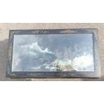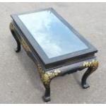 An antique Oriental black lacquered style coffee table with traditional country scenes under glass - dimensions 92cm length x 50cm depth x 45cm height approx