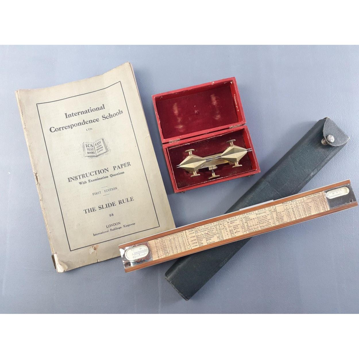 A vintage watchmaker depthing tool compass in original case approx 10cm long inc. needles. Also vintage slide rule in case with a first edition International Correspondence Schools instruction paper (1919). An interesting lot.