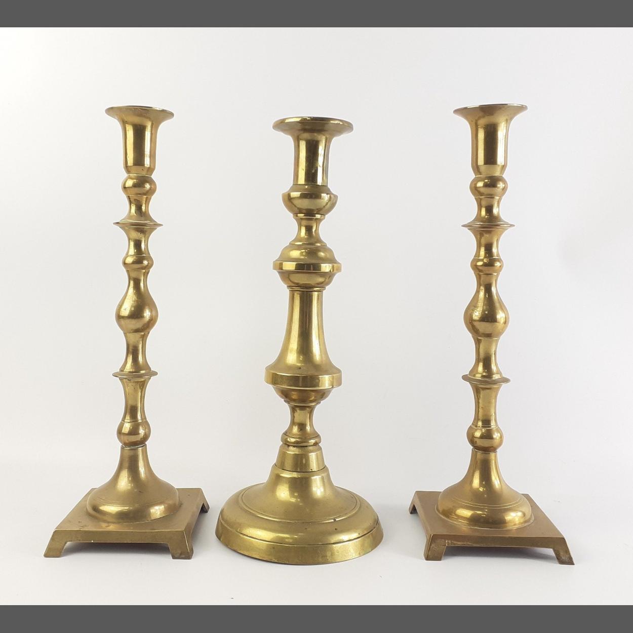 A pair of Edwardian brass candlesticks and one other - taller pair 31cm tall approx
