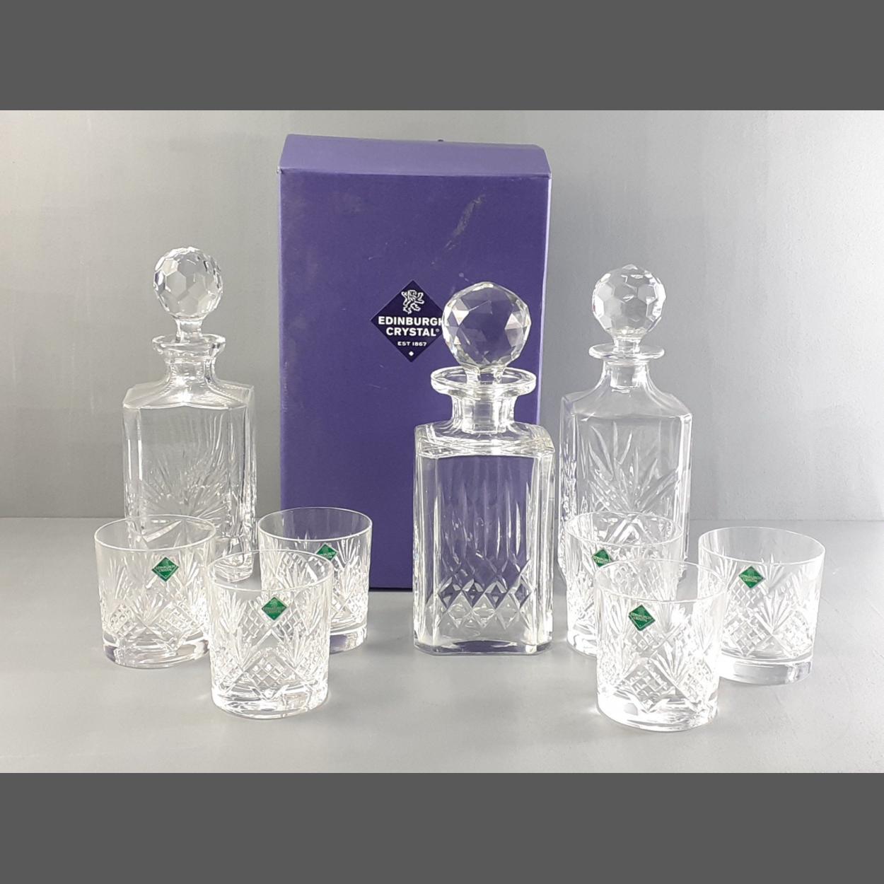Six EDINBURGH CRYSTAL labelled whisky tumblers in lovely condition with stickers. Also three decanters and a box.