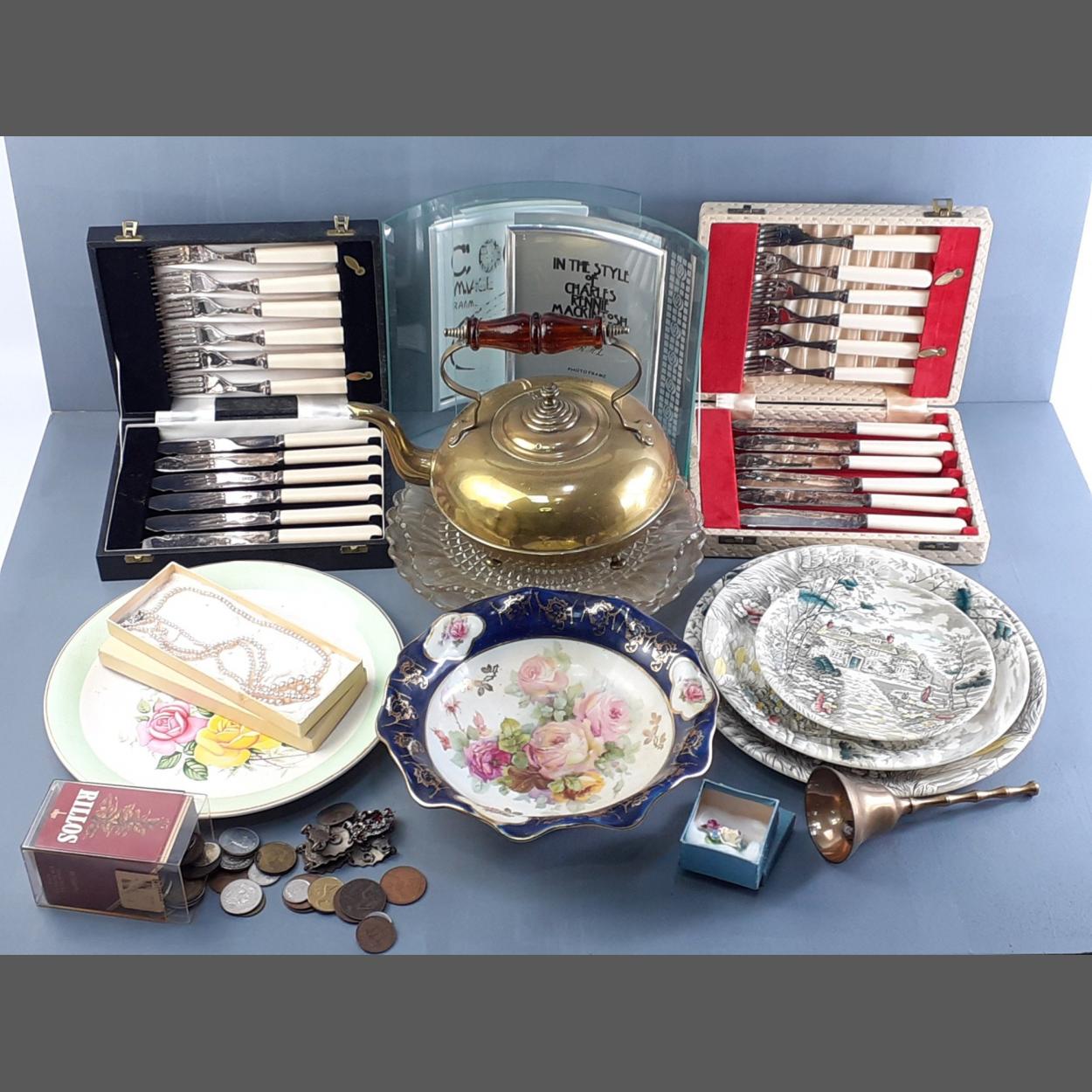 A super mixed lot of items of interest, plates, brass kettle, modern French glass picture frame, plated silverware and a small lot of coins and jewellery including a pretty floral pin and a panel bracelet