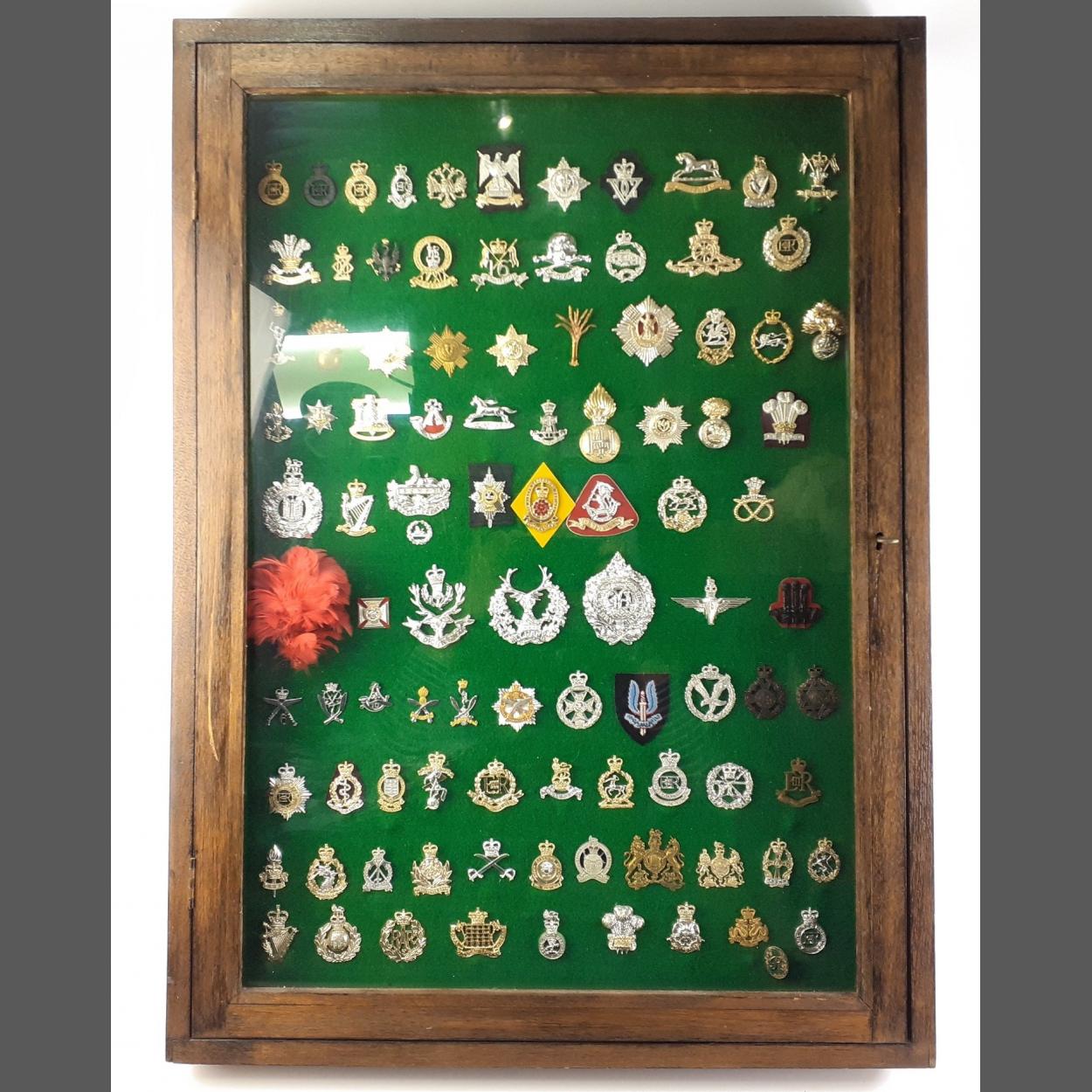 An impressive collection of over 90 BRITISH ARMY Cap Badges in a wonderful display case (82cm x 59cm approx). Many Staybrite QEII but some earlier as well. A super collection well presented.