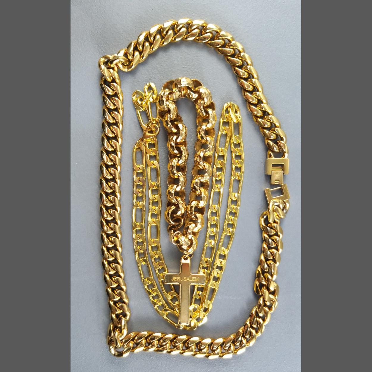 HIP HOP Rapper bling. A large link Cuban chain by KRKC & Co, a link chain, a circular hoop bracelet and an INRI Jerusalem cross.
