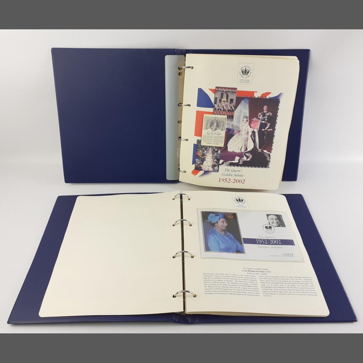 Plush WESTMINSTER MINT STAMPS & COINS albums filled with royal interest THE QUEENS GOLDEN JUBILEE. Each sleeve contains stamp cover with coin. The Royal Family album numbered 1309 contains 16 Crown / £5 Coins from around the Commonwealth. Also another album from the series with FDC First Day Covers and stamps.