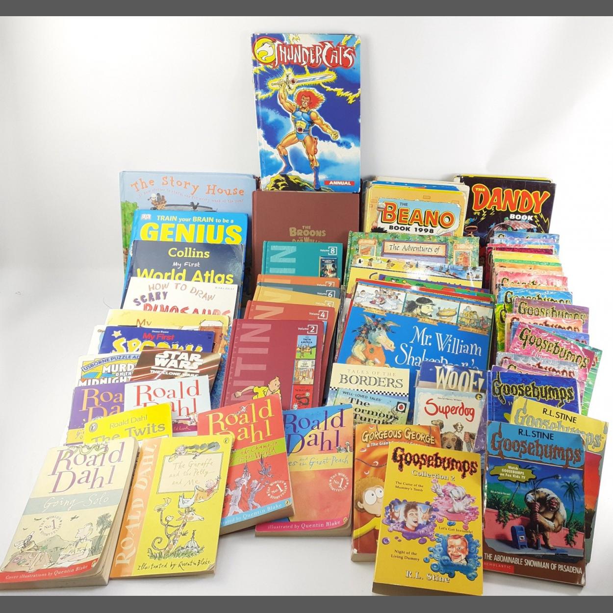 A large tub of children's books to include GOOSEBUMPS, ROALD DAHL, TINTIN, BEANO ANNUALS, etc