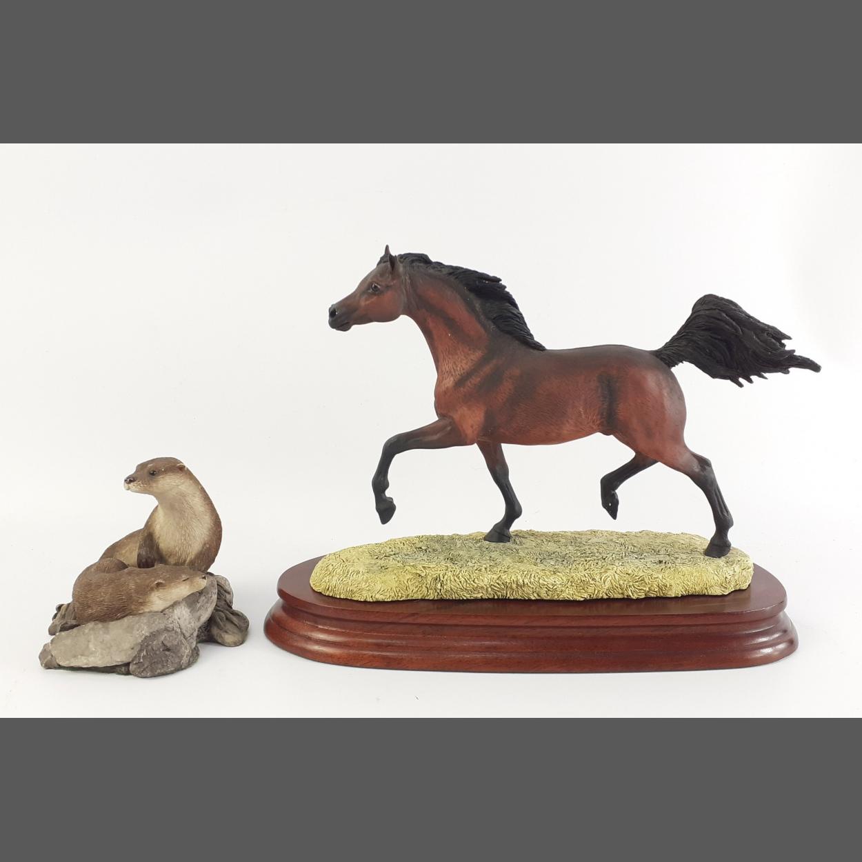Two animal figurines being a limited edition (747/850) BORDER FINE ARTS horse on a plinth signed by ANNE WALL (base 24cm approx) (minor damage to ear) and a pair of otters 9cm high approx. Minor abrasion to ears of one otter.